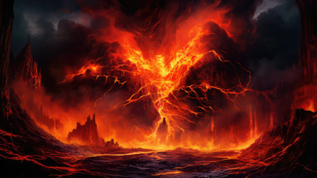 a demon, depicted with realistic hyper-detailed rendering, walks through a flame in this captivating image. the dark explosive atmosphere and structured chaos create a mesmerizing scene. the dominant colors of red and bronze add intensity to the composition. created using cryengine and powered by intel core, this artwork exudes an abrasive authenticity. ai generated