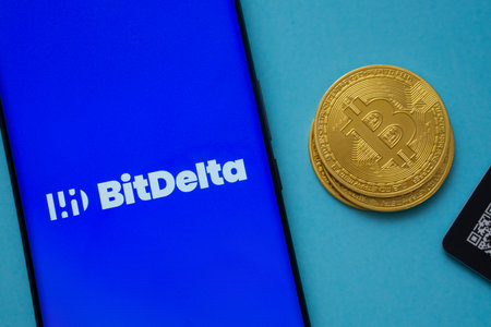 Dhaka, Bangladesh- 07 May 2025: BitDelta logo on smartphone screen near Bitcoin coin and QR code on blue background.