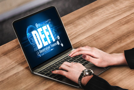 Decentralized finance or DeFi concept on modish computer screen . The defi system give new choice of investment and money saving .