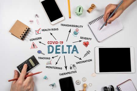 COVID-19 DELTA concept. Meeting table with tablets and mobile phones