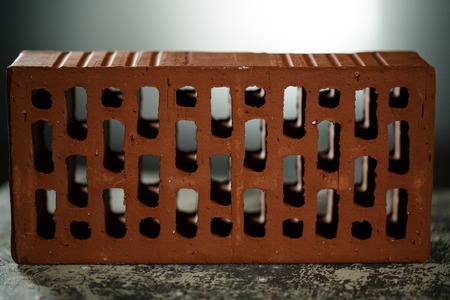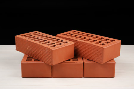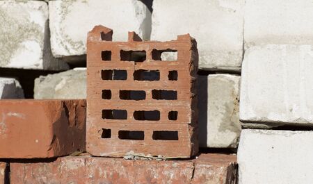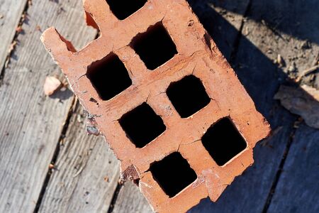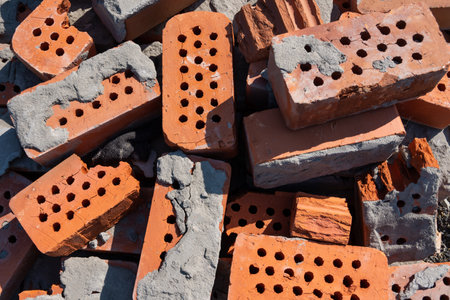 A pile of old red bricks with the remains of dried mortar. Building material red brick with holes. Solid clay bricks used for construction. Concept of repair and building materials