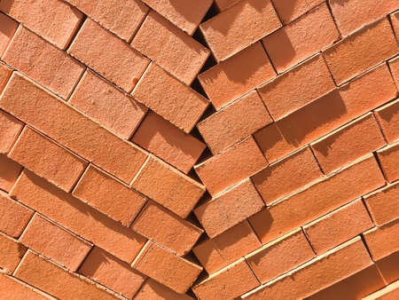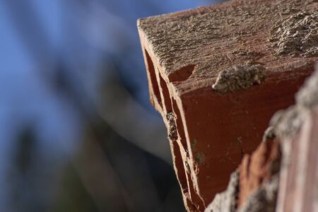 Side angle of a red brick wall corner. Close up view of cracked weathered brickwork material. Modern interior design, unique perspective. Loft like room style at home. Rusty facade architecture.