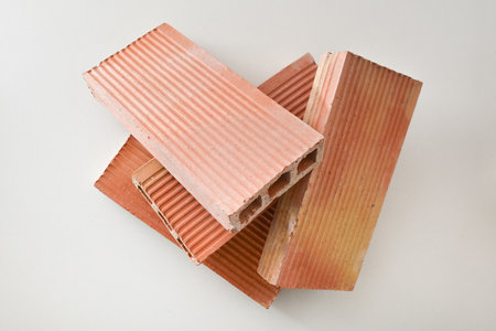 Pile of orange bricks with three holes isolated on white background. Top view.