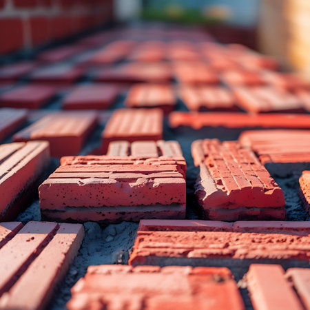 A close-up, low-angle view of numerous red bricks arranged on a bed of gray mortar. The bricks have a rough, porous texture, with visible imperfections and variations in color. The sunlight casts shadows, highlighting the individual shapes and the uneven surface of the laid bricks. The focus is sharp on the foreground bricks, with the background blurring into a soft bokeh.