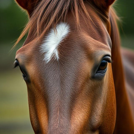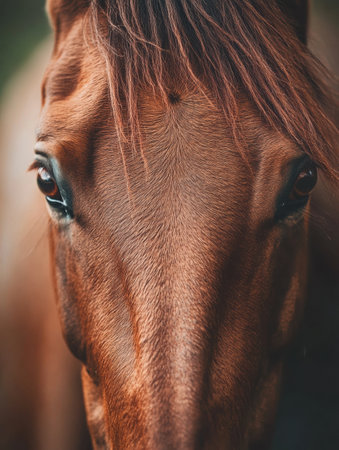 A brown horse stands still, revealing its beautiful, expressive eyes and soft mane under gentle natural light, highlighting its features.