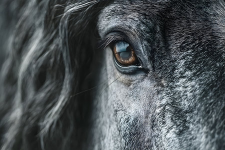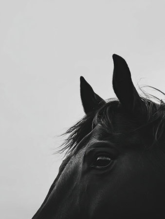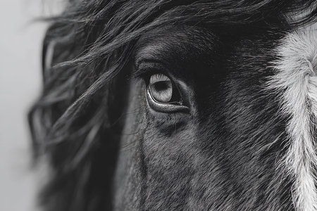 Monochrome image focusing on the intricate details of a horse's eye, capturing the textures and expressions. the composition highlights the beauty and grace of equine features, ideal for animal photography enthusiasts and decor. Generative AI