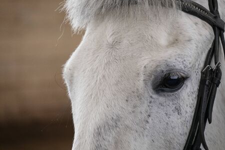 Tersky horse. It was deduced in the times of World War II. Gray suits The white horse looks directly into the camera. Horse close-up. stands at the junctions in the stables