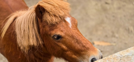 brown shetland breed pony horse in the ranch standing up with closeup photo in the stable