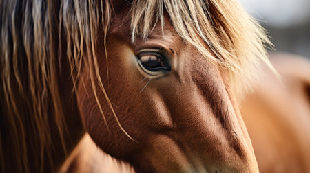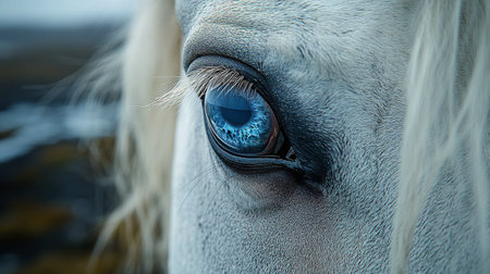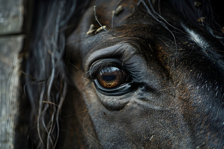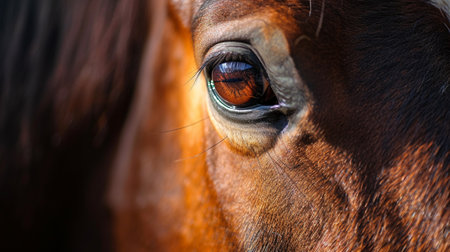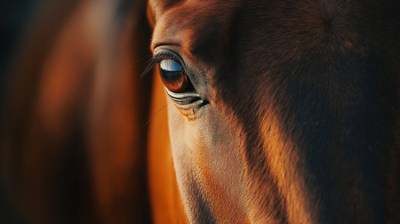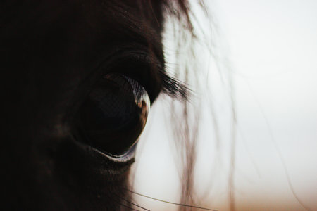A striking close-up portrait showcasing the captivating eye of a horse against a blurred background. A horse eye, focusing on the lashes and fur. The lighting creates a dramatic, intimate feel.