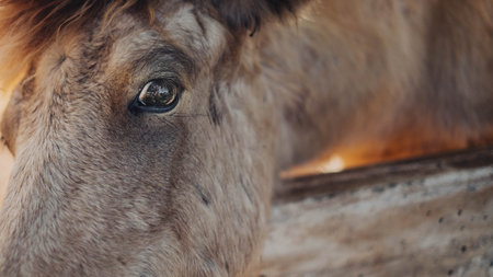 This captivating close up captures a horses eye with stunning detail, highlighting its unique color and texture. The surrounding fur adds to the overall beauty and elegance of the animal.