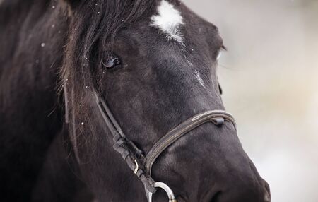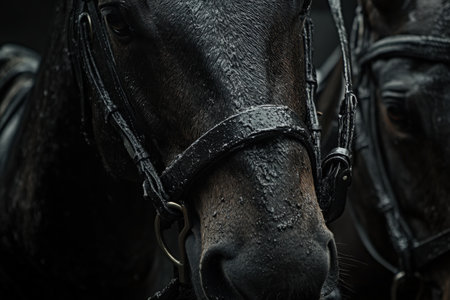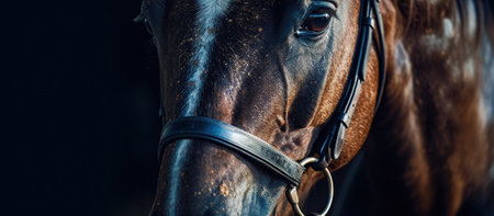 Closeup of a black horse in the bridle on a dark background