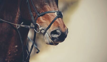 Nose sports brown horse in the bridle. Dressage horse. Equestrian sport.