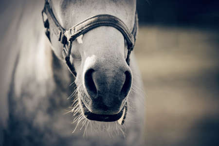 The nose of horse in halter in the paddock. Horse muzzle close up. Sporty stallions gray color in a halter in the levada.