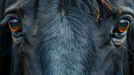 close-up photograph of a black horses eyes, capturing the depth and mystery of its gaze. The horses dark coat and the soft focus of the background create a sense of intimacy.