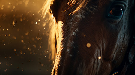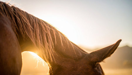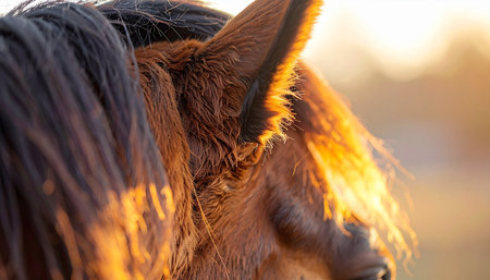 A close-up captures the intricate details of a horses ear and flowing mane, beautifully backlit by the warm, golden glow of a setting sun. This serene moment evokes feelings of peace, tranquility, and a deep connection with nature in a rustic, countryside setting.