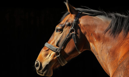 portrait of a bay horse with a bridle on a black background