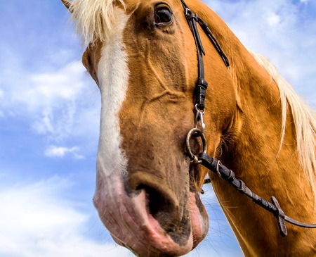 Lowangle view capturing the detailed expression of a horse with an open mouth against a blue sky background
