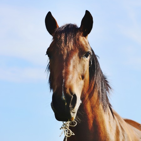 Portrait of a bay horse on a background of the sky.
