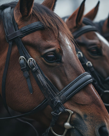 Closeup of beautiful horse head in bridle, ready to ride