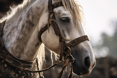 Portrait of a beautiful white horse with a halter on its muzzle and a white mane, which is illuminated by sunlight on a foggy morning. Equestrian life.