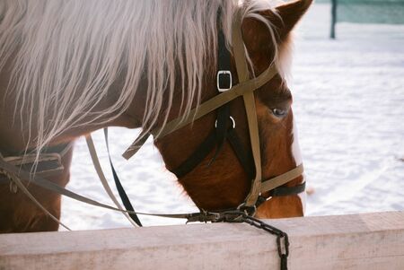 Close up of a horse's head in a bridle. Horizontal shot.