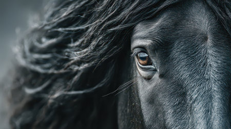 A striking close-up of a black horse showcasing its flowing mane and intense gaze. The image captures the beauty and elegance of this majestic creature in a serene natural setting.