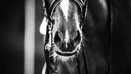 Black-and-white close-up image of the nose of the horse, wearing a bridle and snaffle. Equestrian sport. Nostrils