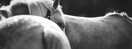 Black and white portrait of a calm beautiful pony with white eyelashes and a halter on its face, standing half-turned next to another pony. Herd.