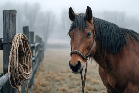 Brown horse wearing a bridle standing near a wooden fence with a rope hanging on it in a foggy pasture