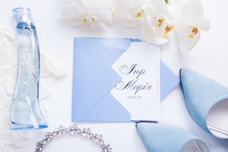 Wedding invitation surrounded with flowers, bride's blue shoes and jewellery. Morning of bride