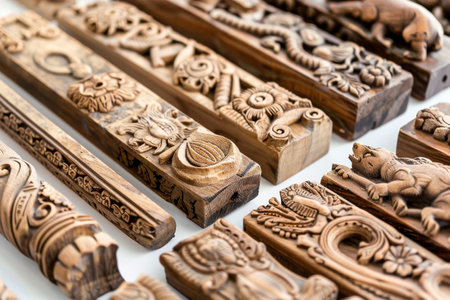 Beautifully detailed wooden artifacts featuring intricate carvings are arranged in a craft shop, highlighting cultural craftsmanship and artistic expression.