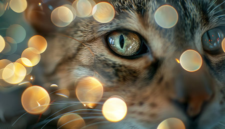 A cats eyes capturing the reflection of holiday lights, surrounded by a whimsical bokeh blur