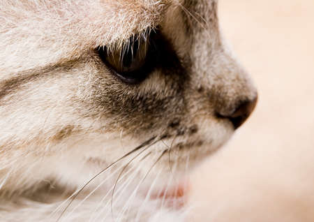 Close up of a cat face. Tabby cat. Felis catus. Side view. Detail background.