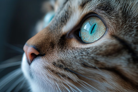 An AI illustration of A close-up shot of a curious white and gray tabby cat with bright blue eyes, looking off to the right with an inquisitive expres