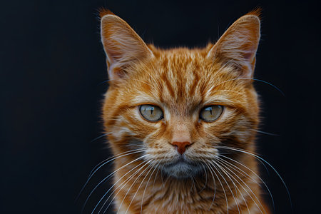 Detailed close-up of an orange tabby cat with striking blue eyes. the cat's expressive face and sharp features stand out against a dark background. ideal for use in pet-themed projects, posters, prints, and digital media. Generative AI