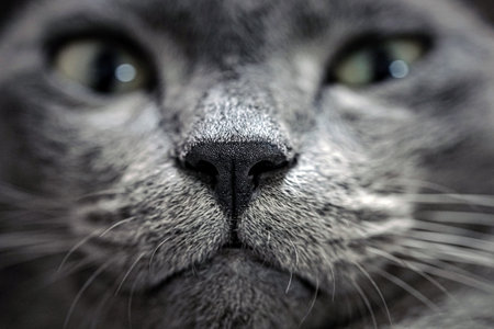Close-up of a gray cat's nose. Selective focus.