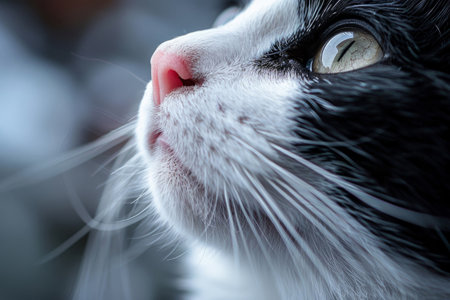 Close up of a white cats nose and whiskers as it deeply inhales, highlighting the intricate details of its sensory organs and emphasizing the importance of smell in feline perception