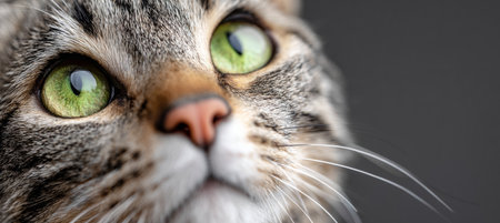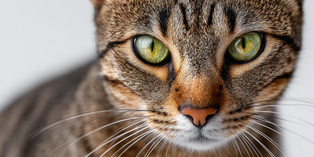 Intense Green Eyes of a Tabby Cat Close-up Portrait with Focus on Furry Face Detail.