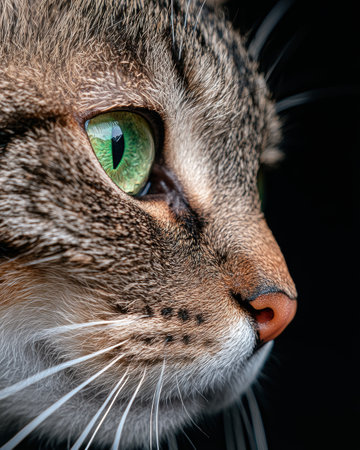 Close-up Portrait of a Majestic Brown Tabby Cat with Striking Green Eyes and Detailed Fur Texture