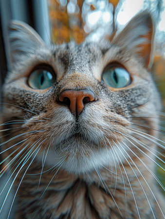 Curious cat looking up with shiny eyes