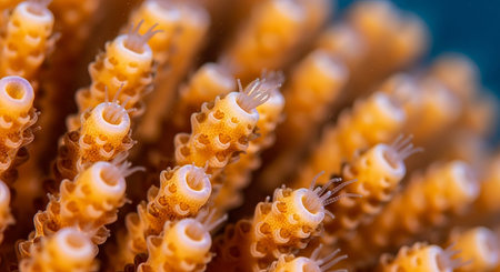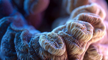 Close up view of a vibrant coral displaying complex organic textures and patterns, highlighting the delicate structures of underwater sea life and its diverse biology