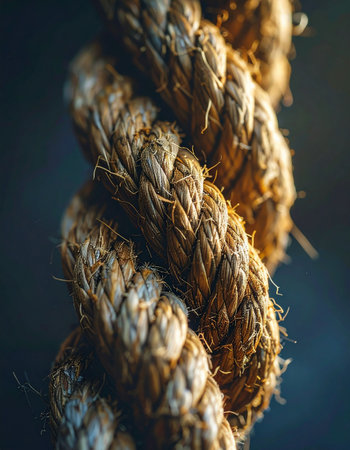 A detailed close-up of a thick, natural fiber rope, its strands tightly twisted together, symbolizing strength, tension, and resilience.