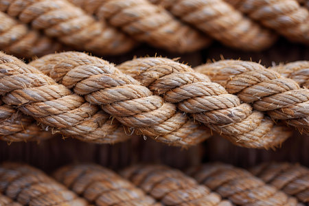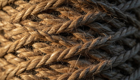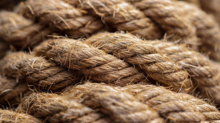 Macro shot of thick, intertwined brown ropes, capturing the detailed texture and fibers, creating a strong and rugged visual effect.