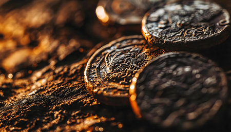 A beautifully engraved coin reveals a regal figure, showcasing intricate designs and textures. Soft light illuminates the metallic surface, highlighting artistry and historical significance.