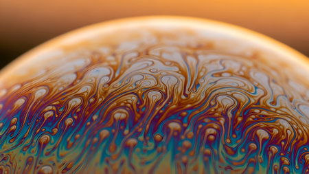 Macro shot of a soap bubble's surface, showcasing swirling patterns and iridescent colors. The thin film creates a mesmerizing display of light and texture.