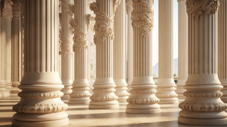 Majestic classical columns in a historic building. Symmetric architectural perspective with soft light. ideal for cultural and architectural themes