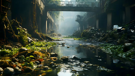 A somber view of a polluted river flowing through an abandoned urban area, showing nature's slow reclaim of decaying structures.