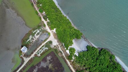 Mangrove rainforest with green trees in the sea water, aerial view. Tropical landscape with mangrove grove.