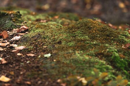 Close-up of the texture of moss and mold on the surface of a tree, macro photography of the microcosm of plants. Beautiful soft focus is behind.