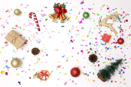 Various party confetti and christmas decoration on a white background with copy space. Colorful celebration background. Flat Lay.